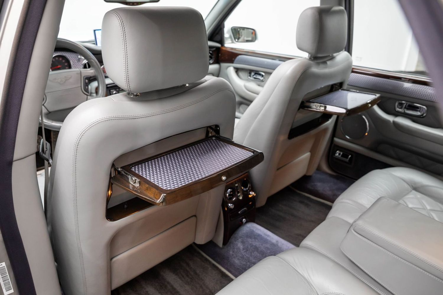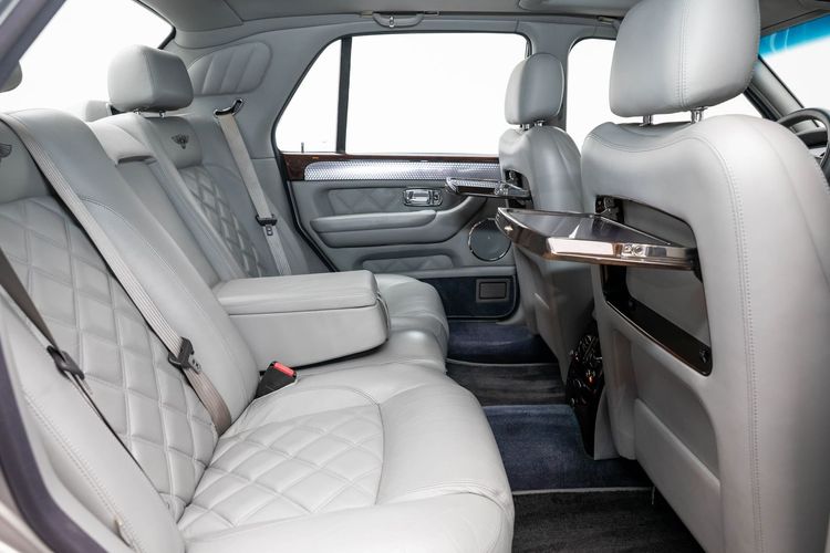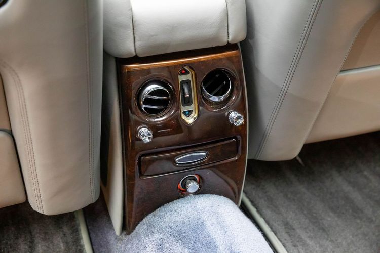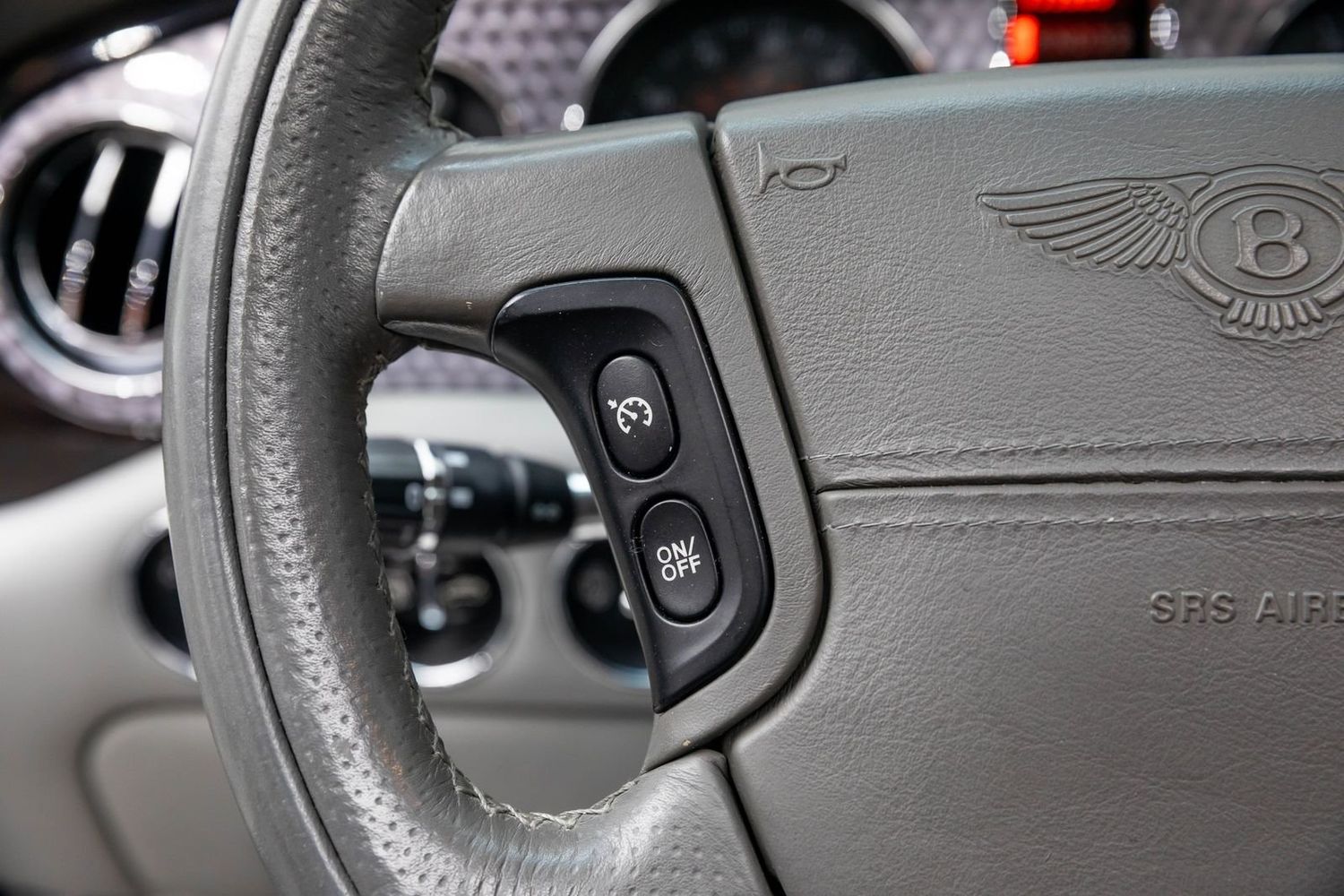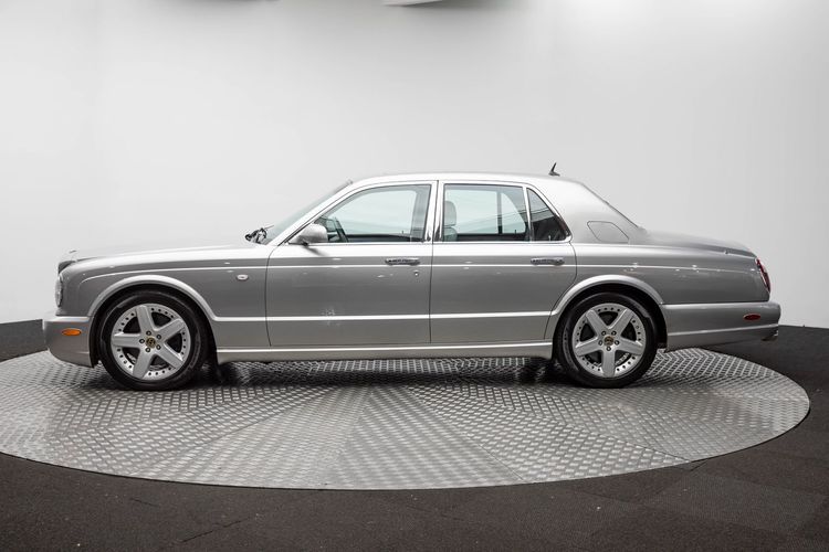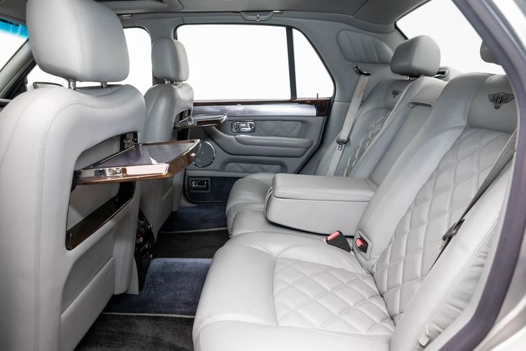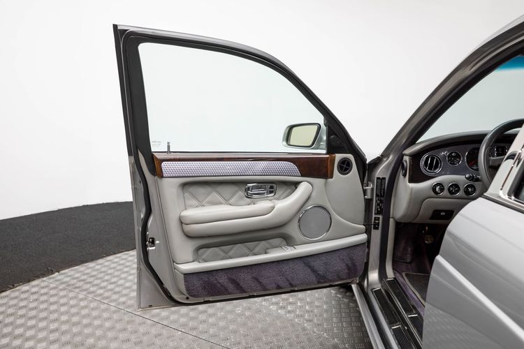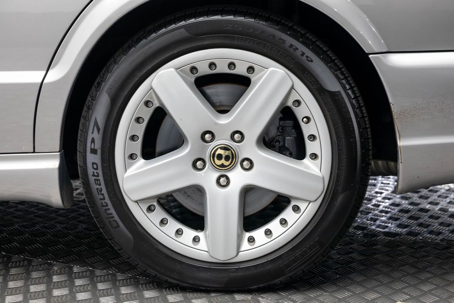 Under the hood lies a formidable 6.75-liter twin-turbocharged V8 engine, delivering an impressive 450 horsepower and 645 lb-ft of torque. This powerhouse propels the Arnage T from zero to sixty in just 5.8 seconds, reaching top speeds up to 170 mph—making it one of the most powerful road-going cars ever produced by Bentley at its launch. The driving experience is further enhanced by factory equipment such as distinctive mesh grille inserts and specific wheels that underscore its sporty demeanor.